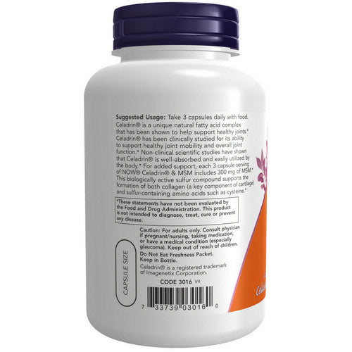 Celadrin is a unique natural fatty acid complex that has been shown to help support healthy joints.* Celadrin has been studied for its ability to support healthy joint mobility and overall joint function.* Scientific studies have shown that Celadrin is well-absorbed and easily utilized by the body.* For added support, each 3 capsule serving of Now Celadrin & MSM includes 300 mg of MSM.* This biologically active sulfur compound supports the formation of both collagen (a key component of cartilage) and sulfur-containing amino acids such as cysteine.*