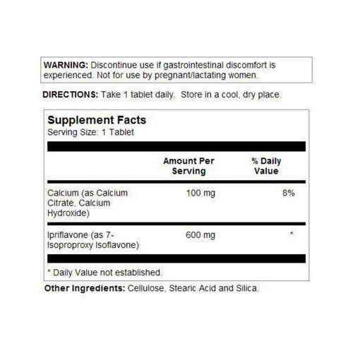Ipriflavone boosts bone mass density and encourages healthy bone mineralization. Get the support of this important nutrient with ipriflavone. Men and women are both at risk for reduced bone density and an increased risk of chronic joint pain and immobility. Ipriflavone is designed to off set this risk by supporting the maintenace of healthy bones. It features of ipriflavone, a potent plant isoflavone that blocks bone resorption. An added dose of calcium supports bone strength and longevity.