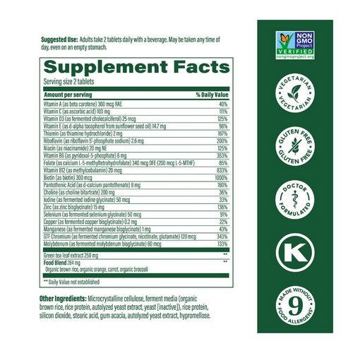 MegaFood Multi for Women 55+ is formulated by award-winning integrative medical physician, Tieraona Low Dog, M.D., specifically for women over the age of 55 who seek optimal health and well-being.* These tablets can be taken any time throughout the day, and are crafted with a blend of vitamins, minerals and green tea leaf extract that support a woman?s unique physiological needs*. It includes 1000 IU (25 mcg) of vitamin D to support healthy bones, * B vitamins and zinc to support cognitive function,* and FoodState B vitamins, including methylated folate and B12, for healthy energy.*