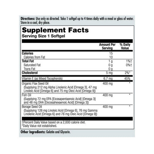 A shortage of Omega 3 in the diet disrupts the balance of Essential Fatty Acids in the body. This formula provides a delicate balance of Omega 3, Omega 6 and Omega 9 with added vitamin E to help prevent oxidation. Borage and organic flax seed oils are cold pressed. Molecularly distilled fish oil comes from cold water fish. Fish oils go through a purity process, including molecular distillation, to remove heavy metals, pcbs, dioxins, furans and other contaminants to meet superior fish oil standards.
