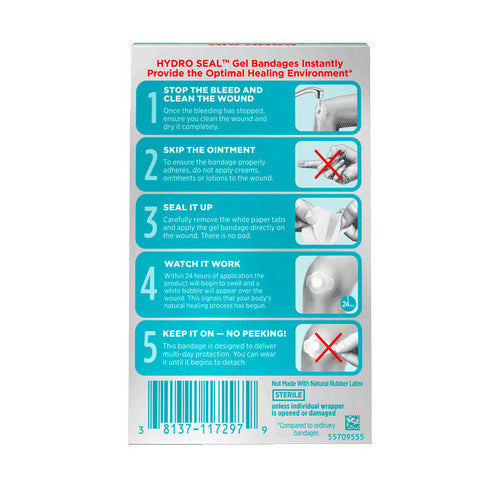 Ideal for use on all parts of the body. Hydro Seal gel bandages instantly provide the optimal healing environment.* These are our most advanced bandages. They work differently than traditional bandages. Shows it's working. Product will swell and a white bubble will form to show the healing process has begun. Cushioning provides protection and relief from painful wounds. Long lasting: stays on for multiple days, even through hand washing and showers. Dual-Action seal. Keep germs out & body's natural healing power in. Multi-day protection. 10- 0.78 in x 2.3 in (2.0 cm x 6.0 cm). *Compared to ordinary bandages.