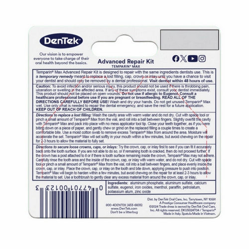 To avoid infection and/or serious injury, this product should not be used if there is throbbing pain, ulceration or swelling in the affected area. If any of these symptoms exist, consult your dentist immediately. This product should not be placed on open wounds. READ ALL OF THE DIRECTIONS CAREFULLY BEFORE USE! Wash and dry your hands. Use only what is needed to repair the dental emergency and save the rest for a future application. KEEP OUT OF REACH OF CHILDREN.