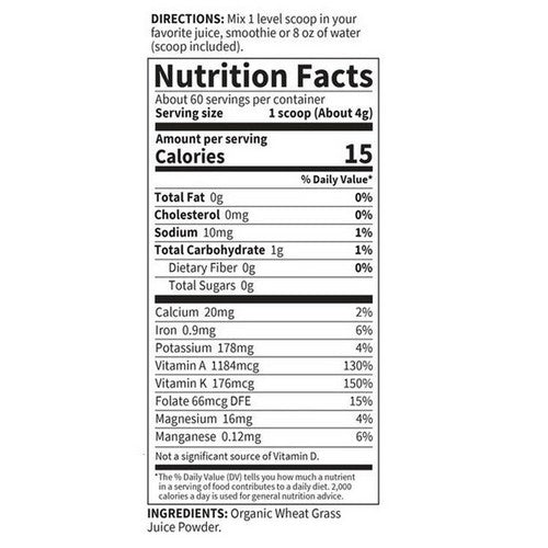 Other Ingredients: 100% Organic U.S.A. Farmed Raw Wheat Grass Juice Powder.