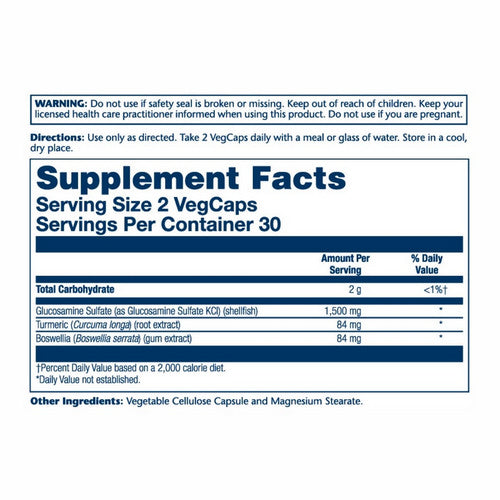Glucosamine sulfate occurring naturally in cells, glucosamine is a pivotal component in the synthesis of connective tissue and joint mobility of Glucosamine. Tumeric and boswelia have also been added as an active support base.