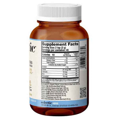 Suggestions Fill a container with 8 oz water or juice. Add two teaspoons of powder and shake well. Drink and enjoy. Can also be added to smoothies, dips, yogurt or other foods. Drink extra water when consuming this product. Special Note Fresh freeze-dried green vegetables and herbs that are naturally high in folate. Absolutely nothing added- no fillers, no sugar or sweeteners, and no preservatives. Warnings |