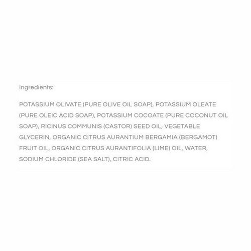 | Ingredients: Potassium Olivate (Pure Olive Oil Soap), Potassium Castorate, Potassium Oleate (Pure Olive Oil Soap), Organic Aloe Barbadensis Leaf Juice, Organic (Willow) Bark Extract, Organic Bergamot Oil, Organic Lime Oil and Vegetable Glycerin. |