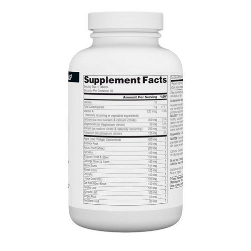 {"id":6869175959637,"title":"Source Naturals, Alka-balance, 120 Tabs","handle":"alkabalance-70018","description":"\u003cstrong\u003eProduct Description\u003c\/strong\u003e\u003cbr\u003e\u003cbr\u003e \u003cdiv class=\"prodDescCls\"\u003e\u003cul\u003e\n\u003cli\u003eConsidered as Dietary Supplement\u003c\/li\u003e\n\u003cli\u003eSupports an Alkaline State\u003c\/li\u003e\n\u003c\/ul\u003e\u003c\/div\u003e \u003cbr\u003e\u003cbr\u003e\u003cstrong\u003eProduct Benefits\u003c\/strong\u003e\u003cbr\u003e\n\t\u003cbr\u003e \u003cbr\u003e\u003cbr\u003e\u003cstrong\u003eIngredients\u003c\/strong\u003e\u003cbr\u003e\u003cbr\u003e \u003cdiv class=\"prodSupCls\"\u003e\u003ctable width=\"100%\" cellspacing=\"0\" cellpadding=\"3\"\u003e\n\u003ctr\u003e\u003ctd colspan=\"3\"\u003e\n\u003cstrong style=\"font-size:16px;\"\u003eSupplement Facts\u003c\/strong\u003e\u003cspan class=\"subSpan\"\u003e\u003cstrong\u003eServing Size:\u003c\/strong\u003e 4 Tablets\u003c\/span\u003e\u003cspan class=\"subSpan\"\u003e\u003cstrong\u003eServings Per Container:\u003c\/strong\u003e 30\u003c\/span\u003e\n\u003c\/td\u003e\u003c\/tr\u003e\n\u003ctr\u003e\n\u003ctd width=\"70%\"\u003e \u003c\/td\u003e\n\u003ctd width=\"15%\"\u003e\u003cstrong\u003eAmount Per Serving\u003c\/strong\u003e\u003c\/td\u003e\n\u003ctd width=\"15%\"\u003e\u003cstrong\u003e%DV\u003c\/strong\u003e\u003c\/td\u003e\n\u003c\/tr\u003e\n\u003ctr\u003e\n\u003ctd\u003eCalories\u003c\/td\u003e\n\u003ctd\u003e10\u003c\/td\u003e\n\u003ctd\u003e \u003c\/td\u003e\n\u003c\/tr\u003e\n\u003ctr\u003e\n\u003ctd\u003eTotal Carbohydrate\u003c\/td\u003e\n\u003ctd\u003e1 g\u003c\/td\u003e\n\u003ctd\u003e\u0026lt;1%*\u003c\/td\u003e\n\u003c\/tr\u003e\n\u003ctr\u003e\n\u003ctd\u003eDietary Fiber\u003c\/td\u003e\n\u003ctd\u003e1 g\u003c\/td\u003e\n\u003ctd\u003e4%*\u003c\/td\u003e\n\u003c\/tr\u003e\n\u003ctr\u003e\n\u003ctd\u003eVitamin A (naturally occurring in vegetable ingredients)\u003c\/td\u003e\n\u003ctd\u003e170 IU\u003c\/td\u003e\n\u003ctd\u003e4%\u003c\/td\u003e\n\u003c\/tr\u003e\n\u003ctr\u003e\n\u003ctd\u003eCalcium (as coral calcium \u0026amp; calcium citrate)\u003c\/td\u003e\n\u003ctd\u003e400 mg\u003c\/td\u003e\n\u003ctd\u003e40%\u003c\/td\u003e\n\u003c\/tr\u003e\n\u003ctr\u003e\n\u003ctd\u003eMagnesium (as magnesium citrate)\u003c\/td\u003e\n\u003ctd\u003e50 mg\u003c\/td\u003e\n\u003ctd\u003e13%\u003c\/td\u003e\n\u003c\/tr\u003e\n\u003ctr\u003e\n\u003ctd\u003eSodium (as sodium citrate)\u003c\/td\u003e\n\u003ctd\u003e200 mg\u003c\/td\u003e\n\u003ctd\u003e8%\u003c\/td\u003e\n\u003c\/tr\u003e\n\u003ctr\u003e\n\u003ctd\u003ePotassium (as potassium citrate)\u003c\/td\u003e\n\u003ctd\u003e125 mg\u003c\/td\u003e\n\u003ctd\u003e4%\u003c\/td\u003e\n\u003c\/tr\u003e\n\u003ctr\u003e\n\u003ctd\u003eCitric Acid (as sodium, magnesium, potassium, and calcium citrate)\u003c\/td\u003e\n\u003ctd\u003e1.25 g\u003c\/td\u003e\n\u003ctd\u003e†\u003c\/td\u003e\n\u003c\/tr\u003e\n\u003ctr\u003e\n\u003ctd\u003eApple Cider Vinegar Concentrate\u003c\/td\u003e\n\u003ctd\u003e400 mg\u003c\/td\u003e\n\u003ctd\u003e†\u003c\/td\u003e\n\u003c\/tr\u003e\n\u003ctr\u003e\n\u003ctd\u003eBurdock Root\u003c\/td\u003e\n\u003ctd\u003e200 mg\u003c\/td\u003e\n\u003ctd\u003e†\u003c\/td\u003e\n\u003c\/tr\u003e\n\u003ctr\u003e\n\u003ctd\u003eKudzu Root\u003c\/td\u003e\n\u003ctd\u003e200 mg\u003c\/td\u003e\n\u003ctd\u003e†\u003c\/td\u003e\n\u003c\/tr\u003e\n\u003ctr\u003e\n\u003ctd\u003eAlfalfa Leaf\u003c\/td\u003e\n\u003ctd\u003e135 mg\u003c\/td\u003e\n\u003ctd\u003e†\u003c\/td\u003e\n\u003c\/tr\u003e\n\u003ctr\u003e\n\u003ctd\u003eBarley Grass\u003c\/td\u003e\n\u003ctd\u003e120 mg\u003c\/td\u003e\n\u003ctd\u003e†\u003c\/td\u003e\n\u003c\/tr\u003e\n\u003ctr\u003e\n\u003ctd\u003eWheat Grass Seed\u003c\/td\u003e\n\u003ctd\u003e120 mg\u003c\/td\u003e\n\u003ctd\u003e†\u003c\/td\u003e\n\u003c\/tr\u003e\n\u003ctr\u003e\n\u003ctd\u003eBladderwrack Thallus (Seaweed)\u003c\/td\u003e\n\u003ctd\u003e100 mg\u003c\/td\u003e\n\u003ctd\u003e†\u003c\/td\u003e\n\u003c\/tr\u003e\n\u003ctr\u003e\n\u003ctd\u003eBroccoli Floret \u0026amp; Stem\u003c\/td\u003e\n\u003ctd\u003e100 mg\u003c\/td\u003e\n\u003ctd\u003e†\u003c\/td\u003e\n\u003c\/tr\u003e\n\u003ctr\u003e\n\u003ctd\u003eCabbage Floret \u0026amp; Stem\u003c\/td\u003e\n\u003ctd\u003e100 mg\u003c\/td\u003e\n\u003ctd\u003e†\u003c\/td\u003e\n\u003c\/tr\u003e\n\u003ctr\u003e\n\u003ctd\u003eCarrot Tap Root\u003c\/td\u003e\n\u003ctd\u003e100 mg\u003c\/td\u003e\n\u003ctd\u003e†\u003c\/td\u003e\n\u003c\/tr\u003e\n\u003ctr\u003e\n\u003ctd\u003eDandelion Root\u003c\/td\u003e\n\u003ctd\u003e100 mg\u003c\/td\u003e\n\u003ctd\u003e†\u003c\/td\u003e\n\u003c\/tr\u003e\n\u003ctr\u003e\n\u003ctd\u003eCollard Leaf\u003c\/td\u003e\n\u003ctd\u003e100 mg\u003c\/td\u003e\n\u003ctd\u003e†\u003c\/td\u003e\n\u003c\/tr\u003e\n\u003ctr\u003e\n\u003ctd\u003eFreeze Dried Pea\u003c\/td\u003e\n\u003ctd\u003e100 mg\u003c\/td\u003e\n\u003ctd\u003e†\u003c\/td\u003e\n\u003c\/tr\u003e\n\u003ctr\u003e\n\u003ctd\u003eOat Bran Fiber Complex\u003c\/td\u003e\n\u003ctd\u003e100 mg\u003c\/td\u003e\n\u003ctd\u003e†\u003c\/td\u003e\n\u003c\/tr\u003e\n\u003ctr\u003e\n\u003ctd\u003eParsley Leaf\u003c\/td\u003e\n\u003ctd\u003e100 mg\u003c\/td\u003e\n\u003ctd\u003e†\u003c\/td\u003e\n\u003c\/tr\u003e\n\u003ctr\u003e\n\u003ctd\u003eSpinach Leaf\u003c\/td\u003e\n\u003ctd\u003e100 mg\u003c\/td\u003e\n\u003ctd\u003e†\u003c\/td\u003e\n\u003c\/tr\u003e\n\u003ctr\u003e\n\u003ctd\u003eGinger Root\u003c\/td\u003e\n\u003ctd\u003e60 mg\u003c\/td\u003e\n\u003ctd\u003e†\u003c\/td\u003e\n\u003c\/tr\u003e\n\u003ctr\u003e\n\u003ctd\u003eRed Beet Root\u003c\/td\u003e\n\u003ctd\u003e60 mg\u003c\/td\u003e\n\u003ctd\u003e†\u003c\/td\u003e\n\u003c\/tr\u003e\n\u003ctr\u003e\n\u003ctd\u003eChlorella\u003c\/td\u003e\n\u003ctd\u003e10 mg\u003c\/td\u003e\n\u003ctd\u003e†\u003c\/td\u003e\n\u003c\/tr\u003e\n\u003ctr\u003e\n\u003ctd\u003eSpirulina\u003c\/td\u003e\n\u003ctd\u003e10 mg\u003c\/td\u003e\n\u003