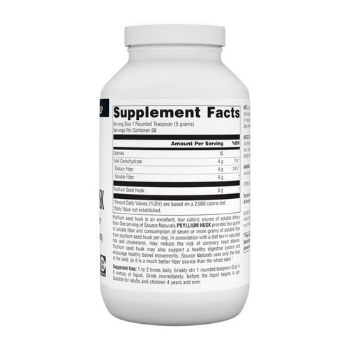 Psyllium seed husk is an excellent, low caloric source of soluble dietary fiber. Consumption of seven or more grams of soluble fiber from psyllium seed husk per day from this product, in association with a diet low in saturated fats and cholesterol, may reduce the risk of coronary heart disease. Source Naturals uses only the husk of the seed, as it is a much better fiber source than the whole seed.