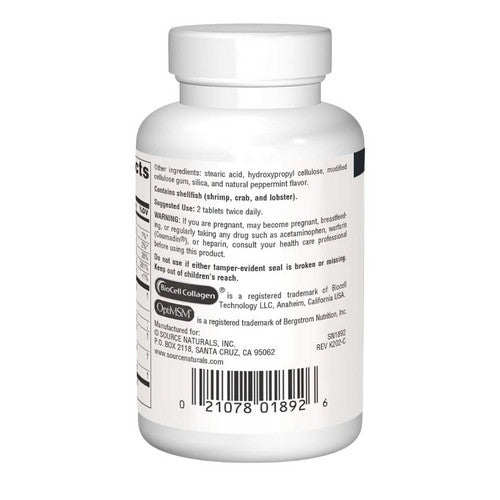 {"id":6869178810453,"title":"Source Naturals, Hyaluronic Joint Complex, 30 Tabs","handle":"hyaluronic-joint-complex-70095","description":"\u003cstrong\u003eProduct Description\u003c\/strong\u003e\u003cbr\u003e\u003cbr\u003e \u003cdiv class=\"prodDescCls\"\u003e\u003cul\u003e\n\u003cli\u003eBioCell Collagen\u003c\/li\u003e\n\u003cli\u003eConsidered as Dietary Supplement\u003c\/li\u003e\n\u003cli\u003eOptiMSM\u003c\/li\u003e\n\u003cli\u003eWith Glucosamine, Chondroitin and MSM\u003c\/li\u003e\n\u003c\/ul\u003e\u003c\/div\u003e \u003cbr\u003e\u003cbr\u003e\u003cstrong\u003eProduct Benefits\u003c\/strong\u003e\u003cbr\u003e\n\t\u003cbr\u003e \u003cbr\u003e\u003cbr\u003e\u003cstrong\u003eIngredients\u003c\/strong\u003e\u003cbr\u003e\u003cbr\u003e \u003cdiv class=\"prodSupCls\"\u003e\u003ctable width=\"100%\" cellspacing=\"0\" cellpadding=\"3\"\u003e\n\u003ctr\u003e\u003ctd colspan=\"3\"\u003e\n\u003cstrong style=\"font-size:16px;\"\u003eSupplement Facts\u003c\/strong\u003e\u003cspan class=\"subSpan\"\u003e\u003cstrong\u003eServing Size:\u003c\/strong\u003e 2 Tablets\u003c\/span\u003e\u003cspan class=\"subSpan\"\u003e\u003cstrong\u003eServing Per Container:\u003c\/strong\u003e 30\u003c\/span\u003e\n\u003c\/td\u003e\u003c\/tr\u003e\n\u003ctr\u003e\n\u003ctd width=\"70%\"\u003e \u003c\/td\u003e\n\u003ctd width=\"15%\"\u003e\u003cstrong\u003eAmount Per Serving\u003c\/strong\u003e\u003c\/td\u003e\n\u003ctd width=\"15%\"\u003e\u003cstrong\u003e%DV\u003c\/strong\u003e\u003c\/td\u003e\n\u003c\/tr\u003e\n\u003ctr\u003e\n\u003ctd\u003eCalories\u003c\/td\u003e\n\u003ctd\u003e15\u003c\/td\u003e\n\u003ctd\u003e \u003c\/td\u003e\n\u003c\/tr\u003e\n\u003ctr\u003e\n\u003ctd\u003eTotal Carbohydrate\u003c\/td\u003e\n\u003ctd\u003e1 g\u003c\/td\u003e\n\u003ctd\u003e\u0026lt;1%*\u003c\/td\u003e\n\u003c\/tr\u003e\n\u003ctr\u003e\n\u003ctd\u003eProtein\u003c\/td\u003e\n\u003ctd\u003e1 g\u003c\/td\u003e\n\u003ctd\u003e2%*\u003c\/td\u003e\n\u003c\/tr\u003e\n\u003ctr\u003e\n\u003ctd\u003eVitamin C (as manganese ascorbate)\u003c\/td\u003e\n\u003ctd\u003e20 mg\u003c\/td\u003e\n\u003ctd\u003e33%\u003c\/td\u003e\n\u003c\/tr\u003e\n\u003ctr\u003e\n\u003ctd\u003eManganese (as manganese ascorbate)\u003c\/td\u003e\n\u003ctd\u003e5 mg\u003c\/td\u003e\n\u003ctd\u003e250%\u003c\/td\u003e\n\u003c\/tr\u003e\n\u003ctr\u003e\n\u003ctd\u003eSodium\u003c\/td\u003e\n\u003ctd\u003e10 mg\u003c\/td\u003e\n\u003ctd\u003e\u0026lt;1%\u003c\/td\u003e\n\u003c\/tr\u003e\n\u003ctr\u003e\n\u003ctd\u003eBioCell Collagen II\u003c\/td\u003e\n\u003ctd\u003e1 g\u003c\/td\u003e\n\u003ctd\u003e†\u003c\/td\u003e\n\u003c\/tr\u003e\n\u003ctr\u003e\u003ctd colspan=\"3\"\u003eYielding:\u003c\/td\u003e\u003c\/tr\u003e\n\u003ctr\u003e\n\u003ctd\u003eType II Collagen\u003c\/td\u003e\n\u003ctd\u003e600 mg\u003c\/td\u003e\n\u003ctd\u003e†\u003c\/td\u003e\n\u003c\/tr\u003e\n\u003ctr\u003e\n\u003ctd\u003eHyaluronic Acid\u003c\/td\u003e\n\u003ctd\u003e100 mg\u003c\/td\u003e\n\u003ctd\u003e†\u003c\/td\u003e\n\u003c\/tr\u003e\n\u003ctr\u003e\n\u003ctd\u003eGlucosamine (as glucosamine sulfate, glucosamine HCl, and N-acetyl glucosamine)\u003c\/td\u003e\n\u003ctd\u003e750 mg\u003c\/td\u003e\n\u003ctd\u003e†\u003c\/td\u003e\n\u003c\/tr\u003e\n\u003ctr\u003e\n\u003ctd\u003eChondroitin Sulfate\u003c\/td\u003e\n\u003ctd\u003e600 mg\u003c\/td\u003e\n\u003ctd\u003e†\u003c\/td\u003e\n\u003c\/tr\u003e\n\u003ctr\u003e\n\u003ctd\u003eMSM (methylsulfonylmethane [OptiMSM])\u003c\/td\u003e\n\u003ctd\u003e450 mg\u003c\/td\u003e\n\u003ctd\u003e†\u003c\/td\u003e\n\u003c\/tr\u003e\n\u003ctr\u003e\u003ctd colspan=\"3\"\u003e*Percent Daily Values (%DV) are based on a 2,000 calorie diet. \u003cbr\u003e†Daily Value not established.\u003c\/td\u003e\u003c\/tr\u003e\n\u003ctr\u003e\u003ctd colspan=\"3\"\u003e\n\u003cb\u003eOther Ingredients\u003c\/b\u003e\u003cdiv class=\"prodIngCls\"\u003e\n\u003cp\u003eStearic acid, modified cellulose gum, silica, and natural peppermint flavor.\u003c\/p\u003e\n\u003cp\u003eContains shellfish (shrimp and crab).\u003c\/p\u003e\n\u003cp\u003eContains no yeast, dairy, egg, gluten, corn, soy or wheat. Contains no sugar, starch, preservatives or artificial color, flavor or fragrance.\u003c\/p\u003e\n\u003c\/div\u003e\n\u003c\/td\u003e\u003c\/tr\u003e\n\u003c\/table\u003e\u003c\/div\u003e\n\t\u003cbr\u003e\u003cbr\u003e\u003cstrong\u003eSuggestions\u003c\/strong\u003e\u003cbr\u003e\u003cbr\u003e \u003cdiv class=\"prodDescCls\"\u003e\n\u003cp\u003e2 tablets twice daily.\u003c\/p\u003e \u003c\/div\u003e \u003cbr\u003e\u003cbr\u003e\u003cstrong\u003eSpecial Note\u003c\/strong\u003e\u003cbr\u003e\u003cbr\u003e\n\tOther Ingredients: stearic acid, modified cellulose gum, and natural peppermint flavor. Contains shellfish.\n\t\u003cbr\u003e\u003cbr\u003e\u003cstrong\u003eWarnings\u003c\/strong\u003e\u003cbr\u003e\u003cbr\u003e \u003cdiv class=\"prodDescCls\"\u003e\n\u003cp\u003eIf you are pregnant, may become pregnant, breastfeeding, or regularly taking any drug such as acetaminophen, warfarin (Coumadin), or heparin, consult your health care professional before taking this product.\u003c\/p\u003e \u003cp\u003eDo not use if either tamper-evident seal is broken or missing. Keep out of the reach of children.\u003c\/p\u003e\n\u003c\/div\u003e \u003cdiv class=\"prodEmtCls\"\u003e\u003c\/div\u003e \u003cbr\u003e\u003cbr\u003e\u003cstrong\u003eCalifornia Proposition 65 WARNING\u003c\/strong\u003e\u003cbr\u003e\u003cbr\u003eSome products on this website contains progesterone, a chemical known to the State of California to cause cancer. Consult with your physician before using this product.\u003cbr\u003e\u003cbr\u003e\u003cstrong\u003eDisclaimer\u003c\/strong\u003e\u003cbr\u003e\u003cbr\u003eHerbsdaily.com offers\n\t\t\t\t\t\t\t\tnationally branded products that are produced according to manufacturing standards\n\t\t\t\t\t\t\t\tset by regulators at everyday low prices. Do not use unproven, unbranded products, which can pose serious risks to your health.","published_