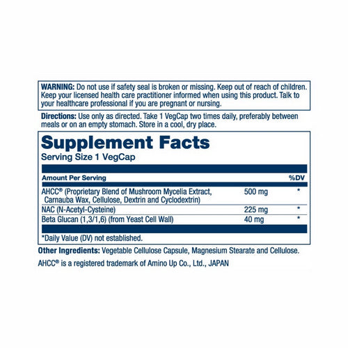 | AHCC (Proprietary Blend of Mushroom Mycelia Extract, Candelilla Wax, Cyclodextrin, and Cellulose) | 500 mg | * |