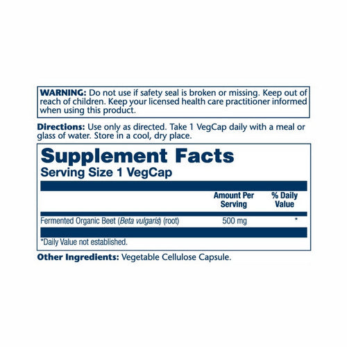 Fermented beet from is a vegan, excipient free product with no fillers or additional ingredients. Supports healthy nitric oxide production. Supports circulatory health. Offers antioxidant support.