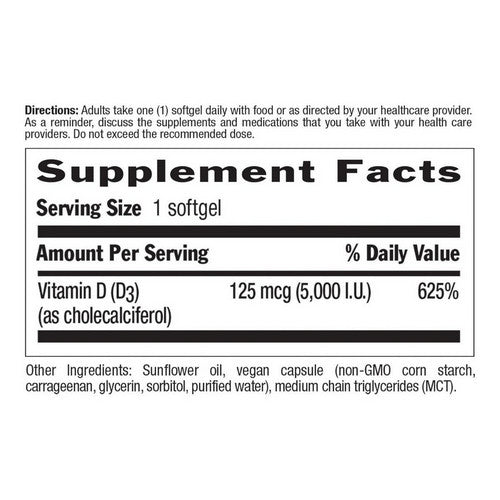 | Vitamin D (D) (as cholecalciferol from Lanolin) | 125 mcg(5,000 IU) | 625% |
