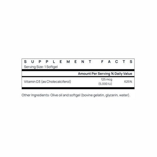 Other Ingredients Extra virgin olive oil. Softgel consists of gelatin, glycerin and water. No wheat, no gluten, no soybeans, no dairy, no egg, no fish/shellfish, no peanuts/tree nuts. 100 IU of Vitamin D is equal to 2.5 micrograms of cholecalciferol. Each softgel contains 125 mcg of cholecalciferol. | ||