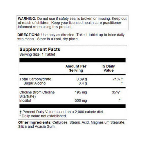 Choline and inositol are intended to provide nutritive support for maintaining cellular integrity, proper nerve function and the normal metabolism of fat. Vegetarian formula in sustained release tablets.