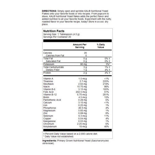 Directions: Simply open and sprinkle KAL® Nutritional Yeast Flakes onto your favorite foods or into recipes. From popcorn to stews, KAL® Nutritional Yeast flakes adds the perfect flavor and added nutrition to all your favorite foods. Experiment with the nutty, roasted flavor in your favorite recipe, today! Store in a cool, dry place