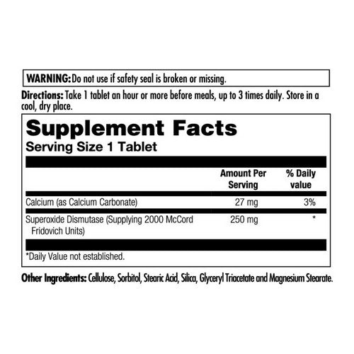 | Calcium (as calcium carbonate) Superoxide Dismutase (Supplying 2000 250 mg McCord Fridovich Units) | 27 mg | 3% |