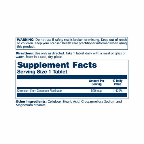 | Chromium (as Chromium Picolinate) | 500 mcg | 417% |