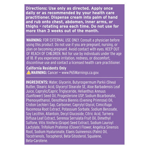 Do not use if you are pregnant, lactating or intend to become pregnant. For external use only. Avoid contact with eyes. Use intended for adults 18 years of age and older. Keep out of the reach of children. Do not exceed 2 oz of this product topically per mouth. Consult with your physician before using this product. This product contains progesterone, a chemical known to the State of California to cause cancer.