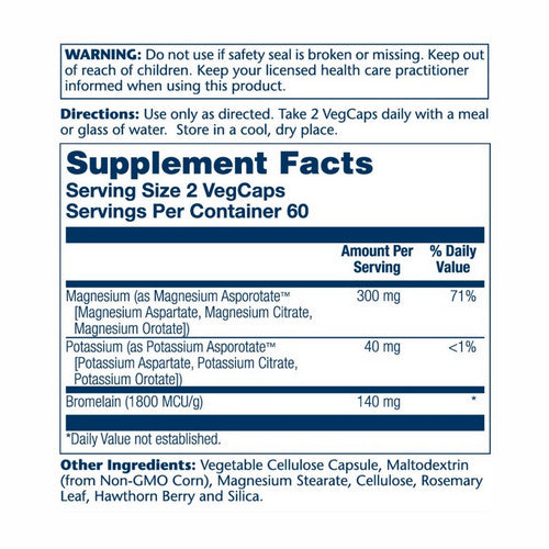 Each capsule of Solaray Magnesium & Potassium Asporotates contains magnesium and potassium which have interacted with the other natural compound producing a natural chelation process resulting in the formation of a special complex containing Magnesium- Potassium Asparate, Magnesium- Potassium Citrate, and Magnesium-Potassium Orotate.