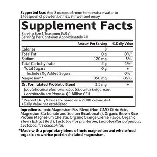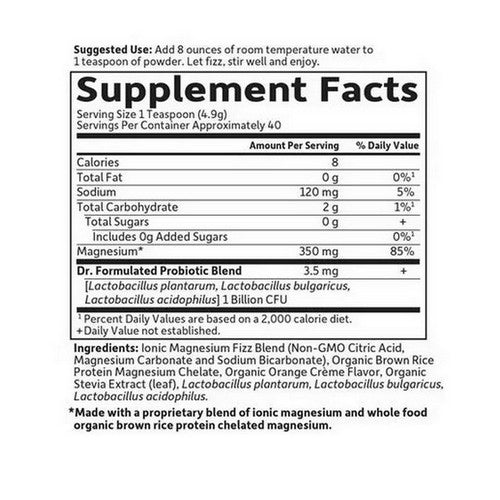| Other Ingredients: Ionic magnesium fizz blend (non-gmo citric acid, magnesium carbonate and sodium bicarbonate), organic brown rice protein magnesium chelate, organic orange creme flavor, organic stevia extract (leaf), lactobacillus plantarum, latcobacillus bulgaricus, lactobacillus acidophilus. | ||