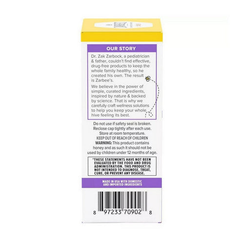 | Ingredients: 3 Ml: Calories 15 Total Carbohydrate 3 G (2% Dv) (Total Sugars 3 G *daily Value [Dv] Not Established, Includes Added Sugars 3 G [12% Dv]) Zinc (As Zinc Gluconate) 0.75 Mg (25% Dv) Proprietary Blend Of Dark Honey 4 G* Water Natural Flavor Citric Acid |