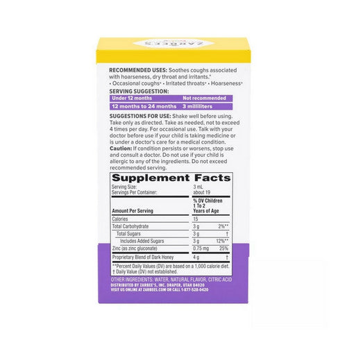 Dark honey plus zinc with a special blend of dark honey to soothe coughs associated with hoarseness, dry throat and irritants.* safe and effective. Number 1 pediatrician recommended cough syrup brand for babies and children 12 and under. Honey gently calms & comforts baby's dry throat.* made with our proprietary blend of dark honey & zinc to support the immune system.*