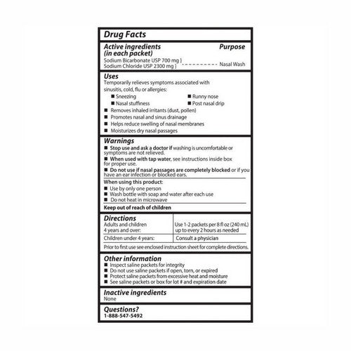Adults and children 4 years and over: Use 1-2 packets up to every 2 hours as needed. Children under 4 years: Consult a physician. Consult Instructions for Use for proper use. Inspect saline solution packets for integrity. Do not use if open or torn. Protect saline solution packet from excessive heat and moisture. Simply dissolve a packet of the pre-mixed, all natural cleansing saline ingredients in the SinuCleanse Net Pot to gently and completely wash your nasal passages.