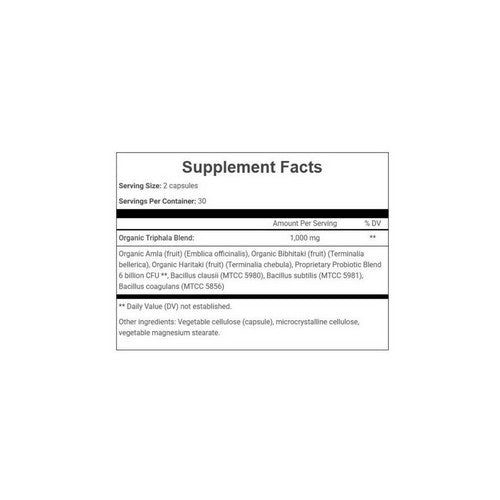 Organic Triphala Blend: Organic Amla (fruit) (Emblica officinalis), Organic Bibhitaki (fruit) (Terminakua bellerica), Organic Haritaki (fruit) (Terminalia Chebula) 1,000 mg