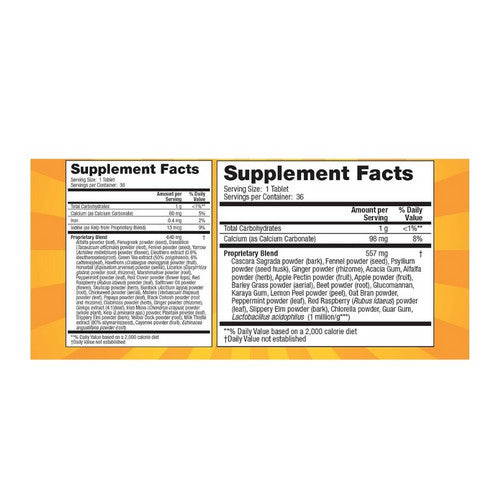 Proprietary Blend Cascara Sagrada powder (bark), Fennel powder (seed), Psyllium powder (seed husk), Ginger powder (rhizome), Acacia Gum, Alfalfa powder (herb), Apple Pectin powder (fruit), Apple powder (fruit), Barley Grass powder (aerial), Beet powder (root), Glucomannan, Karaya Gum, Lemon Peel powder (peel), Oat Bran powder, Peppermint powder (leaf), Red Raspberry (Rubus idaeus) powder (leaf), Slippery Elm powder (bark), Chlorella powder, Guar Gum, Lactobacillus acidophilus (1 million/g***) |