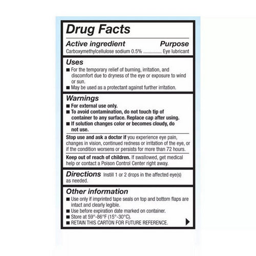 Active Ingredients: Carboxymethylcellulose Sodium 0.5%. InActive Ingredients: Boric Acid; Calcium Chloride; Magnesium Chloride; Potassium Chloride; Purified Water; Purite (Stabilized Oxychloro Complex); Sodium Borate; Sodium Chloride; may also contain: Hydrochloric Acid and/or Sodium Hydroxide to adjust pH