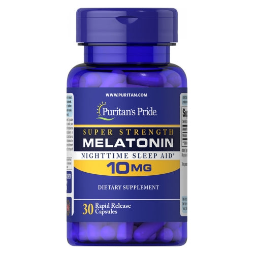 Puritan's Pride Super Strength Melatonin Nighttime Sleep Aid* is a trial-size version of our popular 10 mg product. This product contains 30 Rapid Release capsules, for a 30 day trial.Melatonin is a hormone that is naturally produced in the body. Melatonin is closely involved in the natural sleep cycle.* Because inefficient sleep can affect your energy and your mood, melatonin is a terrific choice if you experience occasional sleeplessness or jet lag, or if you want to improve your quality of rest.*Melatonin helps you fall asleep faster and stay asleep longer.* When taken at bed time, melatonin may provide blood pressure support for blood pressure already within a normal range.* Melatonin’s effects on blood pressure may help support restful sleep and a relaxed mood.*