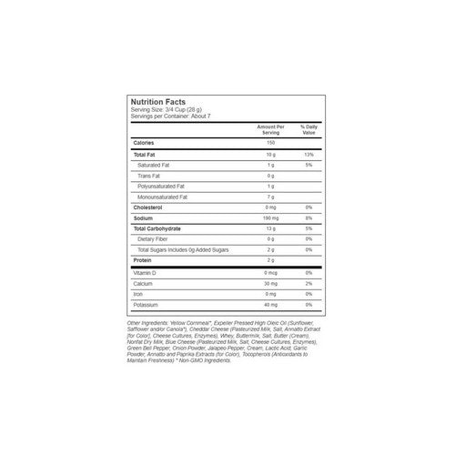| Ingredients: Yellow Corn Meal, Expeller Pressed High Oleic Oil (Sunflower, Safflower And or Canola), Cheddar Cheese (Pasteurized Milk, Salt, Annatto Extract [For Color], Cheese Cultures, Enzymes), Whey, Buttermilk, Salt, Butter, Green Bell Pepper, Blue Cheese (Pasteurized Milk, Salt, Cheese Cultures, Enzymes), Onion Powder, Jalapeno Pepper, Garlic Powder, Lactic Acid, Annatto And Paprika Extracts (For Color), Tocopherols (Antioxidants To Preserve Freshness). | ||