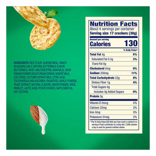 Other Ingredients: Rice Flour, Almond Meal, Ranch Seasoning (Salt, Natural Buttermilk Flavor (Buttermilk, Whey, Maltodextrin, Skim Milk), Sour Cream Powder (Sour Cream [cream, Nonfat Milk, Cultures), Cultured Nonfat Milk, Citric Acid, Tocopherols And Ascorbyl Palmitate), Garlic Powder, Yeast Extract, Natural Flavors, Onion Powder, Spice, Parsley, Lactic Acid), Potato Starch, Safflower Oil, Soy Lecithin
