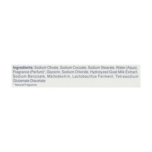 | Ingredients: ?Sodium Olivate, Sodium Cocoate, Sodium Stearate, Aqua (Water), Fragrance (Parfum), Glycerin, Sodium Chloride, Hydrolyzed Goat Milk Extract, Sodium Benzoate, Maltodextrin, Lactobacillus Ferment,Tetrasodium Glutamate Diacetate. |