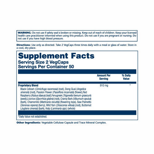 | Proprietary Blend�Black Cohosh (Cimicifuga racemosa) (root), Dong Quai (Angelica sinensis) (root), Passion Flower (Passiflora incarnata) (flower), Red Raspberry (Rubus idaeus) (leaf), Fenugreek (Trigonella foenum-graecum) (seed), Licorice (Glycrrhiza glabra) (root), Cramp Bark (Viburnum opulus) (bark), Chamomile (Matricaria recutita) (flowering tops), Saw Palmetto (Serenoa repens) (berry), Wild Yam (Dioscorea villosa) (root), Butternut (Juglans cinerea) (bark), Kelp (Laminaria spp.) (whole) | 920 mg | * |