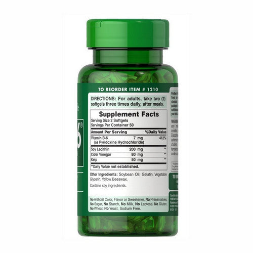 Kelp, Lecithin, Vitamin B-6 and Cider Vinegar, all-in-one softgel. Kelp works to maintain a healthy thyroid; Lecithin is an excellent natural source of choline and inositol; B-6 functions as a coenzyme involved in protein and fat metabolism and Cider Vinegar is a natural and rich source of potassium and other associated minerals.*