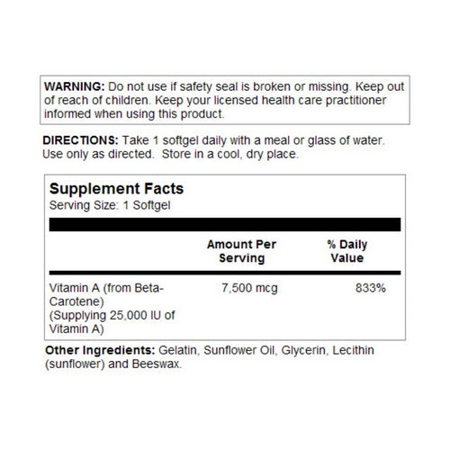 | Vitamin A (from Beta-Carotene) (Supplying 25,000 IU of Vitamin A) | 7,500 mcg | 833% |