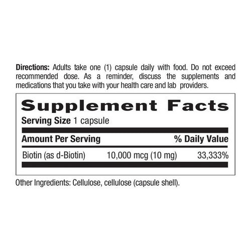 | Biotin (as d-Biotin) | 10,000 mcg (10 mg) | 3,333% |