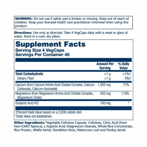 Calcium and magnesium are intended to provide nutritive support for healthy bones, teeth, muscle and nervous system function. The calcium and magnesium in this product are chelated to whole rice concentrate rather than ordinary soy, yeast, or milk, proteins, which are commonly used. Glutamic acid is added for enhanced mineral absorption. A special herb base has been added for additional nutritive support.