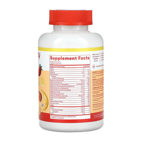 Other Ingredients Organic cane sugar, organic tapioca syrup, gelatin, pectin, citric acid, natural flavors, colors added (black carrot juice concentrate, annatto, turmeric). Free of yeast, wheat, milk, eggs, gluten, peanuts, shellfish, artificial colors, artificial flavors and salicylates. Sustainably sourced: This product contains essential omega 3 oils derived from anchovy and sardine. Do not consume if you have a known fish allergy. | |||