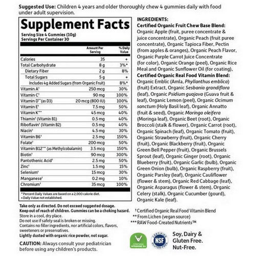 orange (peel), organic rice meal and organic sunflower oil (for coating). Certified organic real food vitamin blend: organic emblic (amla, phyllanthus emblica) (fruit) extract, organic sesbania grandiflora (leaf), organic psidium guajava (guava fruit & leaf), organic lemon (peel), organic ocimum sanctum (holy basil leaf), organic annatto (fruit & seed), organic moringa oleifera (moringa leaf), organic beet (root), organic broccoli (stalk & flower), organic carrot (root), organic spinach (leaf), organic tomato (fruit), organic strawberry (fruit), organic cherry (fruit), organic blackberry (fruit), organic green bell pepper (fruit), organic brussels sprout (leaf), organic ginger (root), organic blueberry (fruit), organic garlic (bulb), organic green onion (bulb), organic raspberry (fruit), organic parsley (leaf), organic cauliflower (flower & stem), organic red cabbage (leaf), organic asparagus (flower & stem), organic celery (stalk), organic cucumber (gourd), organic kale (leaf). | ||