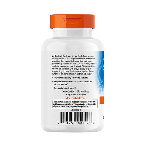 Doctor's Best Vegan D3 supports healthy bone density and structure.* Vitamin D is required for optimal calcium absorption.* Vitamin D3 enhances and helps to regulate immune function, support optimal cardiovascular function and enhances cellular function.*