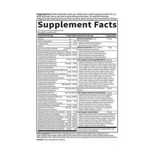 Mental & Physical Energy, Vitamin B Complex, Chromium, Iron,Healthy Heart,Vitamin B Complex, Vitamins C, E,Antioxidant Cellular Protection, Vitamins C, EHealthy Immune Vitamins A, C, D3, Selenium, Zinc Healthy Metabolism, Vitamin B-Complex, Chromium,Healthy Joints and Bones, Vitamins A, C, D3, Calcium, Magnesium, Zinc Your body is designed to recognize and utilize nutrients best when they come from food. Each individual nutrient delivered to your body from food comes intact with its own specific and unique cofactors that tell your body where and how to utilize that nutrient. When vitamins or minerals are isolated from food or synthesized in a lab, their cofactors can be removed, inhibiting their ability to effectively nourish your body. While a diet rich in RAW, whole foods is the best way to consume nutrients, if you are going to supplement, you should seek out a whole food liquid multivitamin formula with RAW whole food vitamins and minerals.