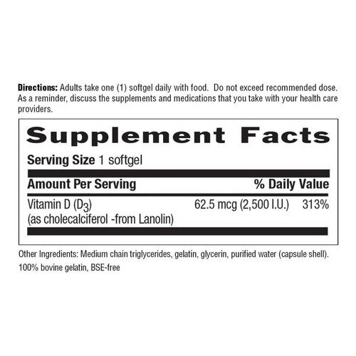 | Vitamin D (D3) (as cholecalciferol - from Lanolin) | 2500 IU | 625% |