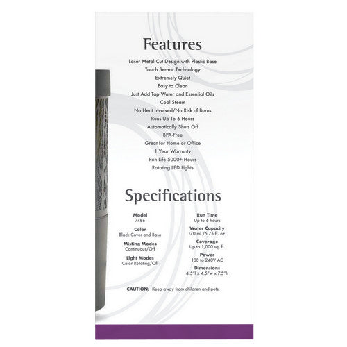 Easy to clean, Cool steam, No heat involved/no risk of burns, Automatically shuts off, Great for home, office, or travel, Fits in car beverage holder, Includes portable carrying case. Run life of 5000+ hours, Plugs into any USB port, Rotating LED lights, Run time of up to 6 hours.
