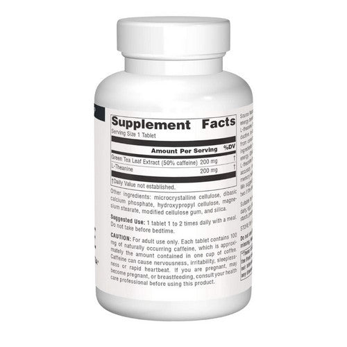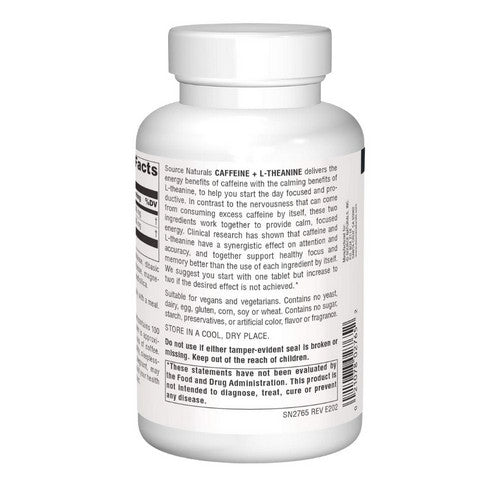 Source Naturals Caffeine + L-Theanine delivers the energy benefits of caffeine with the calming benefits of L-theanine, to help you start the day focused and productive. In contrast to the nervousness that can come from consuming excess caffeine by itself, these two ingredients work together to provide calm, focused energy. Research has shown that caffeine and L-theanine have a synergistic effect on attention and accuracy, and together support healthy focus and memory better than the use of each ingredient by itself. We suggest you start with one tablet but increase to two if the desired effect is not achieved.*