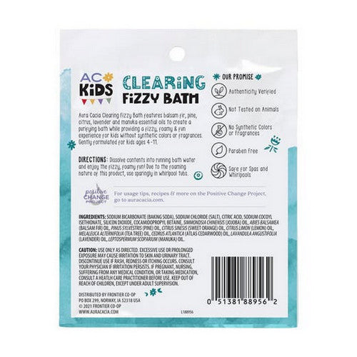Kids clearing fizzy bath featuring the essential oils of balsam fir, pine, citrus, lavender and manuka to create a purifying and clearing bath, while providing a fizzy, foamy and fun experience for kids. Gently formulated without synthetic colors or fragrances for kids ages 4-11.