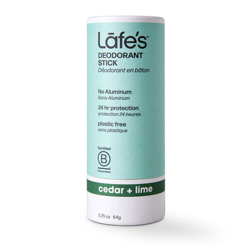 Lafes cedar & lime paper barrel natural stick deodorant is paraben free and baking soda free with proven 24 hour protection using natural botanical essential oils without the use of harmful chemicals. New paper barrel packaging contains no plastic and is completely compostable, and can be shredded in a paper shredder.