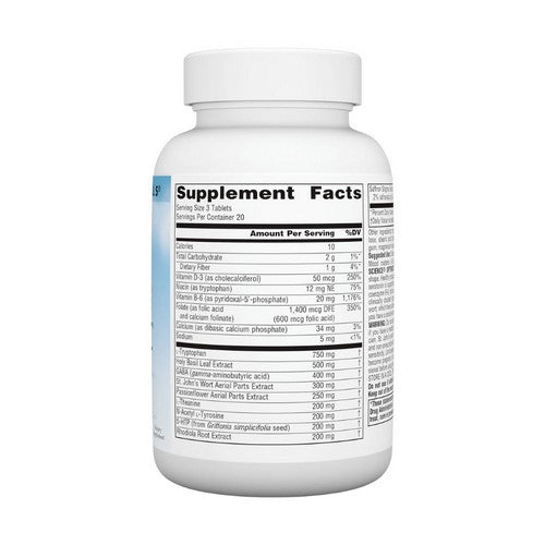 {"id":6869229633621,"title":"Source Naturals, Serene Science Optimistic, 60 Tabs","handle":"serene-science-optimistic-144451","description":"\u003cstrong\u003eProduct Description\u003c\/strong\u003e\u003cbr\u003e\u003cbr\u003e \t\t\t\t\t\t\t \t\t\t\t\t\t\t Mood matters. A bright mood can make your day. Optimistic can help keep your mood in optimal shape. Healthy production of the mood-regulating neurotransmitter serotonin is supported by the key ingredients l-tryptophan, 5-HTP, coenzyme B-6, folic acid and folinic acid. Optimistic features the clinically studied ingredients vitamin D.\t\t\t\t \n\t\t\t\t\t\t \n\t\t\t\t\t\t \u003cbr\u003e\u003cbr\u003e\u003cstrong\u003eProduct Benefits\u003c\/strong\u003e\u003cbr\u003e\n\t\u003cbr\u003e Harmonious Mood*.\nDietary Supplement. \u003cbr\u003e\u003cbr\u003e\u003cstrong\u003eIngredients\u003c\/strong\u003e\u003cbr\u003e\u003cbr\u003e \u003cdiv class=\"prodSupCls\"\u003e\n\u003ctable width=\"100%\" border=\"1\" cellspacing=\"0\" cellpadding=\"3\"\u003e\n\u003ctr\u003e\n \u003ctd colspan=\"3\"\u003e\n\u003cp\u003e\u003cstrong\u003eSupplement Facts for \t\t\t\t \t\t\t \t\t\t\t\t\t\t Tablet\u003c\/strong\u003e\u003c\/p\u003e\n \u003cp\u003e\u003cstrong\u003e\u003cspan style=\"float: right\"\u003eServing Size: 3 Tablets\u003c\/span\u003e\u003c\/strong\u003e\u003c\/p\u003e\n\u003c\/td\u003e\n\u003c\/tr\u003e\n \n \u003ctr\u003e\n \u003ctd width=\"49%\"\u003e\u003c\/td\u003e\n \u003ctd width=\"24%\"\u003e\u003cstrong\u003eAmount Per Serving \u003c\/strong\u003e\u003c\/td\u003e\n \u003ctd width=\"27%\"\u003e\u003cstrong\u003e%Daily Value\u003c\/strong\u003e\u003c\/td\u003e\n \u003c\/tr\u003e\n \n \u003ctr\u003e\n \u003ctd\u003eCalories\u003c\/td\u003e\n \u003ctd\u003e10\u003c\/td\u003e\n \u003ctd\u003e \u003c\/td\u003e\n \u003c\/tr\u003e\n \n \u003ctr\u003e\n \u003ctd style=\"height: 27px\"\u003eTotal Carbohydrate\u003c\/td\u003e\n \u003ctd style=\"height: 27px\"\u003e2 g\u003c\/td\u003e\n \u003ctd style=\"height: 27px\"\u003e\u0026lt;1%\u003c\/td\u003e\n \u003c\/tr\u003e\n \n \u003ctr\u003e\n \u003ctd\u003eDietary Fiber\u003c\/td\u003e\n \u003ctd\u003e1 g\u003c\/td\u003e\n \u003ctd\u003e4%\u003c\/td\u003e\n \u003c\/tr\u003e\n \n \u003ctr\u003e\n \u003ctd\u003eVitamin D-3 (as cholecalciferol)\u003c\/td\u003e\n \u003ctd\u003e50 mcg (2,000 IU)\u003c\/td\u003e\n \u003ctd\u003e250%\u003c\/td\u003e\n \u003c\/tr\u003e\n \n \u003ctr\u003e\n \u003ctd\u003eNiacin (as tryptophan)\u003c\/td\u003e\n \u003ctd\u003e12 mg NE\u003c\/td\u003e\n \u003ctd\u003e75%\u003c\/td\u003e\n \u003c\/tr\u003e\n \n \u003ctr\u003e\n \u003ctd\u003eVitamin B-6 (as pyridoxal-5'-phosphate)\u003c\/td\u003e\n \u003ctd\u003e20 mg\u003c\/td\u003e\n \u003ctd\u003e1,176%\u003c\/td\u003e\n \u003c\/tr\u003e\n \n \u003ctr\u003e\n \u003ctd\u003eFolate (as folic acid and calcium folinate) (800 mcg folic acid) \u003c\/td\u003e\n \u003ctd\u003e1,333 mcg DFE\u003c\/td\u003e\n \u003ctd\u003e \u003c\/td\u003e\n \u003c\/tr\u003e\n \n \u003ctr\u003e\n \u003ctd\u003eCalcium\u003c\/td\u003e\n \u003ctd\u003e37 mg\u003c\/td\u003e\n \u003ctd\u003e3%\u003c\/td\u003e\n \u003c\/tr\u003e\n \n \u003ctr\u003e\n \u003ctd\u003eSodium\u003c\/td\u003e\n \u003ctd\u003e5 mg\u003c\/td\u003e\n \u003ctd\u003e\u0026lt;1%\u003c\/td\u003e\n \u003c\/tr\u003e\n \n \u003ctr\u003e\n \u003ctd\u003eL-Tryptophan\u003c\/td\u003e\n \u003ctd\u003e750 mg\u003c\/td\u003e\n \u003ctd\u003e \u003c\/td\u003e\n \u003c\/tr\u003e\n \n \u003ctr\u003e\n \u003ctd\u003eHoly Basil Leaf Extract\u003c\/td\u003e\n \u003ctd\u003e500 mg\u003c\/td\u003e\n \u003ctd\u003e \u003c\/td\u003e\n \u003c\/tr\u003e\n \n \u003ctr\u003e\n \u003ctd\u003eGABA (gamma-aminobutyric acid)\u003c\/td\u003e\n \u003ctd\u003e400 mg\u003c\/td\u003e\n \u003ctd\u003e \u003c\/td\u003e\n \u003c\/tr\u003e\n \u003ctr\u003e\n \u003ctd\u003eSt. John's Wort Aerial Parts Extract\u003c\/td\u003e\n \u003ctd\u003e300 mg\u003c\/td\u003e\n \u003ctd\u003e \u003c\/td\u003e\n \u003c\/tr\u003e\n \n \n \n \n\n \n \n \n \n \n \n \n \n \n \n \n \n \n \n \n \n \n \u003ctr\u003e\n \u003ctd\u003ePassionflower Aerial Parts Extract\u003c\/td\u003e\n \u003ctd\u003e250 mg\u003c\/td\u003e\n \u003ctd\u003e \u003c\/td\u003e\n \u003c\/tr\u003e\n \n \n \n \n\n \n \n \n \n \n \n \n \n \n \n \n \n \n \n \n \n \n \u003ctr\u003e\n \u003ctd\u003e5-HTP (from Griffonia simplicifolia seed)\u003c\/td\u003e\n \u003ctd\u003e200 mg\u003c\/td\u003e\n \u003ctd\u003e \u003c\/td\u003e\n \u003c\/tr\u003e\n \n \n \n \n\n \n \n \n \n \n \n \n \n \n \n \n \n \n \n \n \n \n \u003ctr\u003e\n \u003ctd\u003eN-Acetyl l-Tyrosine\u003c\/td\u003e\n \u003ctd\u003e200 mg\u003c\/td\u003e\n \u003ctd\u003e \u003c\/td\u003e\n \u003c\/tr\u003e\n \n \n \n \n\n \n \n \n \n \n \n \n \n \n \n \n \n \n \n \n \n \n \u003ctr\u003e\n \u003ctd\u003eRhodiola Root Extract\u003c\/td\u003e\n \u003ctd\u003e200 mg\u003c\/td\u003e\n \u003ctd\u003e \u003c\/td\u003e\n \u003c\/tr\u003e\n \n \n \n \n\n \n \n \n \n \n \n \n \n \n \n \n \n \n \n \n \n \n \u003ctr\u003e\n \u003ctd\u003eL-Theanine\u003c\/td\u003e\n \u003ctd\u003e200 mg\u003c\/td\u003e\n \u003ctd\u003e \u003c\/td\u003e\n \u003c\/tr\u003e\n \n \n \n \n\n \n \n \n \n \n \n \n \n \n \n \n \n \n \n \n \n \n \u003ctr\u003e\n \u003ctd\u003eSaffron Stigma Extract (standardized to 2% safranals by UV-Vis)\u003c\/td\u003e\n \u003ctd\u003e15 mg\u003c\/td\u003e\n \u003ctd\u003e \u003c\/td\u003e\n \u003c\/tr\u003e\n \n \n \n \n\n \n \n \n \n \n \n \n \n \n \n \n \n \n \n \n \n \n \u003ctr\u003e\n \u003ctd colspan=\"3\"\u003e\n\u003cstrong\u003eOther Ingredients: \u003c\/strong\u003eMicrocrystalline \n\t cellulose, hydroxypropyl cellulose, stearic acid, dibasic calcium \n\t phosphate, modified cellulose gum, magnesium stearate, and silica. \u003c\/td\u003e\n \u003c\/tr\u003e\n\u003c\/table\u003e\n\u003c\/div\u003e\n\n\t\u003cbr\u003e\u003cbr\u003e\u003cstrong\u003eSuggestions\u003c\/strong\u003e\u003cbr\u003e\u003cbr\u003e Suggested Use: 3 tablets daily with meals. \u003cbr\u003e\u003cbr\u003e\u003cstrong\u003eSpecial N