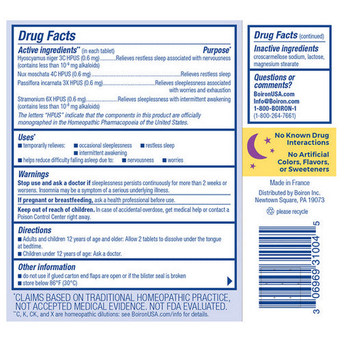Sleepcalm provides an over the counter solution to relieve occasional sleeplessness, restless sleep, and intermittent awakening. This homeopathic medicine calms restless sleep, so you can fall asleep and stay asleep without feeling groggy the next day. Its made with plant based active ingredients that help restore a natural sleep pattern disturbed by nervousness, worries, exhaustion, an overactive mind, jet lag, or night shift work. The meltaway tablets are convenient to take without water at bedtime, and can be taken on an empty stomach.